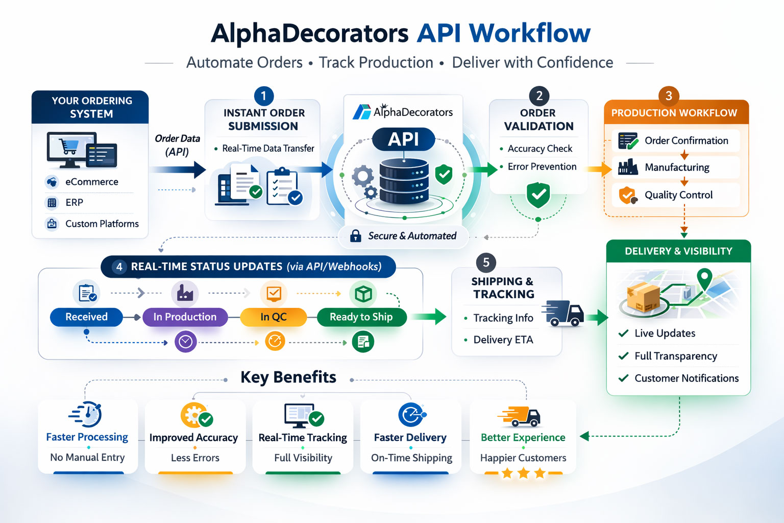 Connect your ordering system directly with AlphaDecorators. Automate order processing, reduce manual work, and gain real-time visibility into production status and delivery tracking.